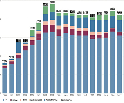 2000~ 2018 年艾滋病疫苗投入的资金数额及组成。