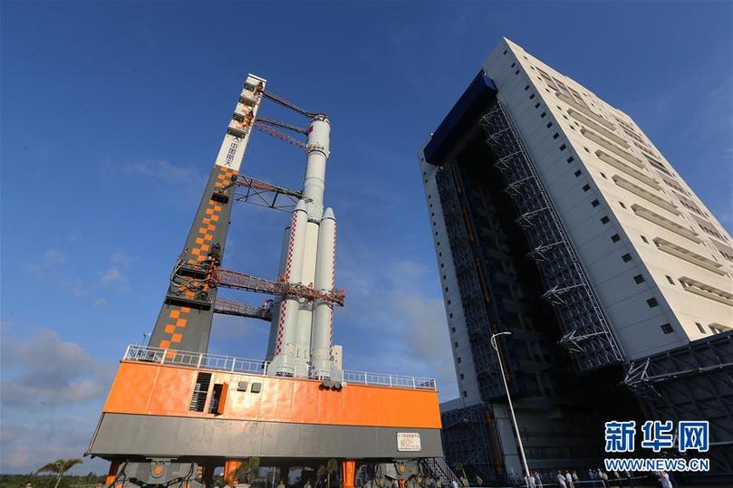 4日17日,长征七号遥二运载火箭与天舟一号货运飞船组合体在垂直转运中。
