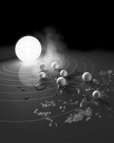 利用斯皮策观测到的数据,团队精确测量了7颗行星的大小——质量最小的约为0.4个地球,最大的约为1.4个地球;团队还首次估计了其中6颗的质量,并认为它们都可能是岩态行星,但最外侧的第7颗行星质量还没估算出来,科学家认为,它可能是个冰冷的雪球状世界。
