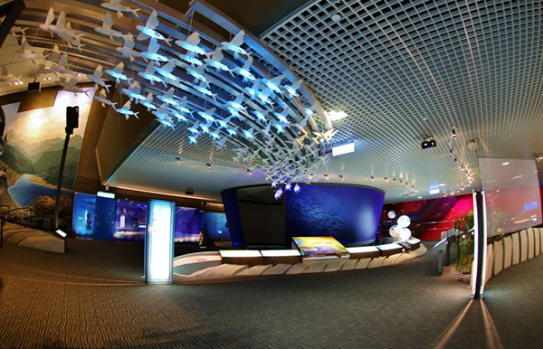 在展厅楼层布局方面,“兰博”践行“连结在地文化、开启宜兰之窗”的理念,设有四层展区,从上到下分为别为“山之层”、“平原层”、“海之层”(图3)与“儿童探索区”。前三者分别展现了宜兰多雨气候下“迷雾森林”的景致;平原上的自然环境如何塑造当地人文特色、影响历史变迁;海岸线、海底、海流以及讨海人的生活等等极富宜兰特色的内容。而站在山之层俯瞰其他楼层,仿佛看到一个有特定地理环境与人文轨迹的微缩宜兰,如此通过展区设计延伸了观众的想象空间。