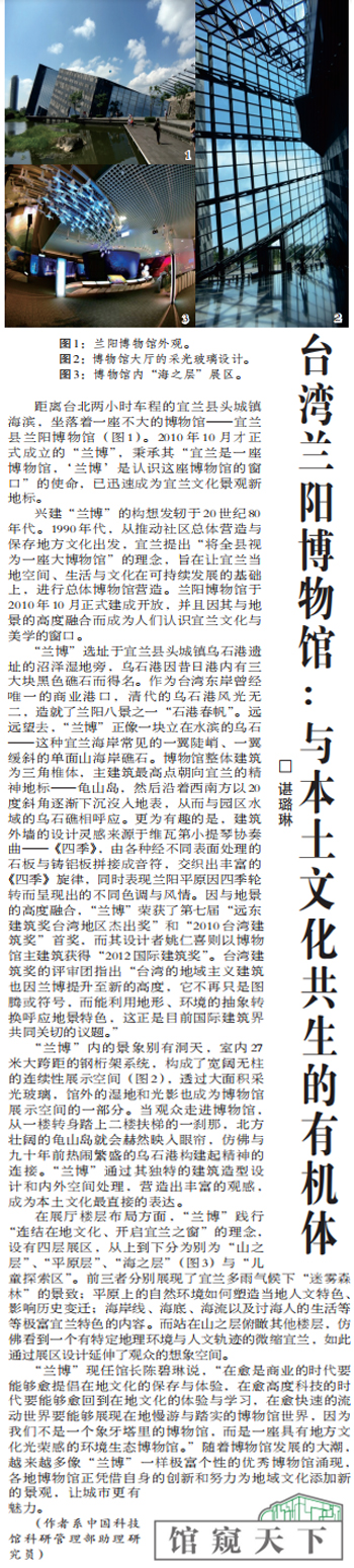 “兰博”现任馆长陈碧琳说,“在愈是商业的时代要能够愈提倡在地文化的保存与体验,在愈高度科技的时代要能够愈回到在地文化的体验与学习,在愈快速的流动世界要能够展现在地慢游与踏实的博物馆世界,因为我们不是一个象牙塔里的博物馆,而是一座具有地方文化光荣感的环境生态博物馆。”随着博物馆发展的大潮,越来越多像“兰博”一样极富个性的优秀博物馆涌现,各地博物馆正凭借自身的创新和努力为地域文化添加新的景观,让城市更有魅力。