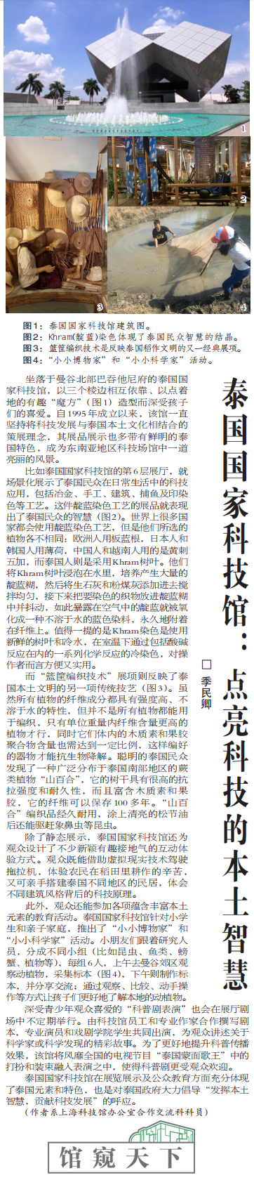 比如泰国国家科技馆的第六层展厅,就场景化展示了泰国民众在日常生活中的科技应用,包括冶金、手工、建筑、捕鱼及印染色等工艺。这件靛蓝染色工艺的展品就表现出了泰国民众的智慧(图2)。世界上很多国家都会使用靛蓝染色工艺,但是他们所选的植物各不相同:欧洲人用板蓝根,日本人和韩国人用薄荷,中国人和越南人用的是黄刺五加,而泰国人则是采用Khram树叶。他们将Khram树叶浸泡在水里,培养产生大量的靛蓝糊,然后将生石灰和粉煤灰添加进去搅拌均匀,接下来把要染色的织物放进靛蓝糊中并抖动,如此暴露在空气中的靛蓝就被氧化成一种不溶于水的蓝色染料,永久地附着在纤维上。值得一提的是Khram染色是使用新鲜的树叶和冷水,在室温下通过包括酸碱反应在内的一系列化学反应的冷染色,对操作者而言方便又实用。