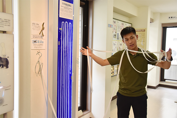 在二层中间位置“人兽共患寄生虫”展区,展示了一个长达8.8米的绦虫标本,旁边有一条绳带让观众体验缠绕在人体内8.8米的绦虫究竟有多长(图3)。这条寄生虫名为“日本海裂头绦虫”,是一位40岁的男性在食用了感染寄生虫的大马哈鱼后,从小肠中排出的。小小寄生虫仅用三个月就长到如此之大,着实令人震惊。