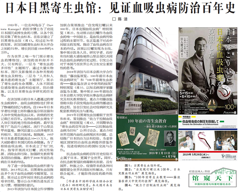 2019年目黑寄生虫馆着眼于世界和未来,策划推出“致力于控制血吸虫病”特别展览(图4),并同期举办“寄生虫的百年战争——以控制血吸虫病为目标”公开讨论会,重点介绍世界范围内血吸虫病现状和问题,总结推广日本防治方法和经验,为亚非地区国家防治血吸虫病提供借鉴参考,促进疫病防治的国际交流与合作。