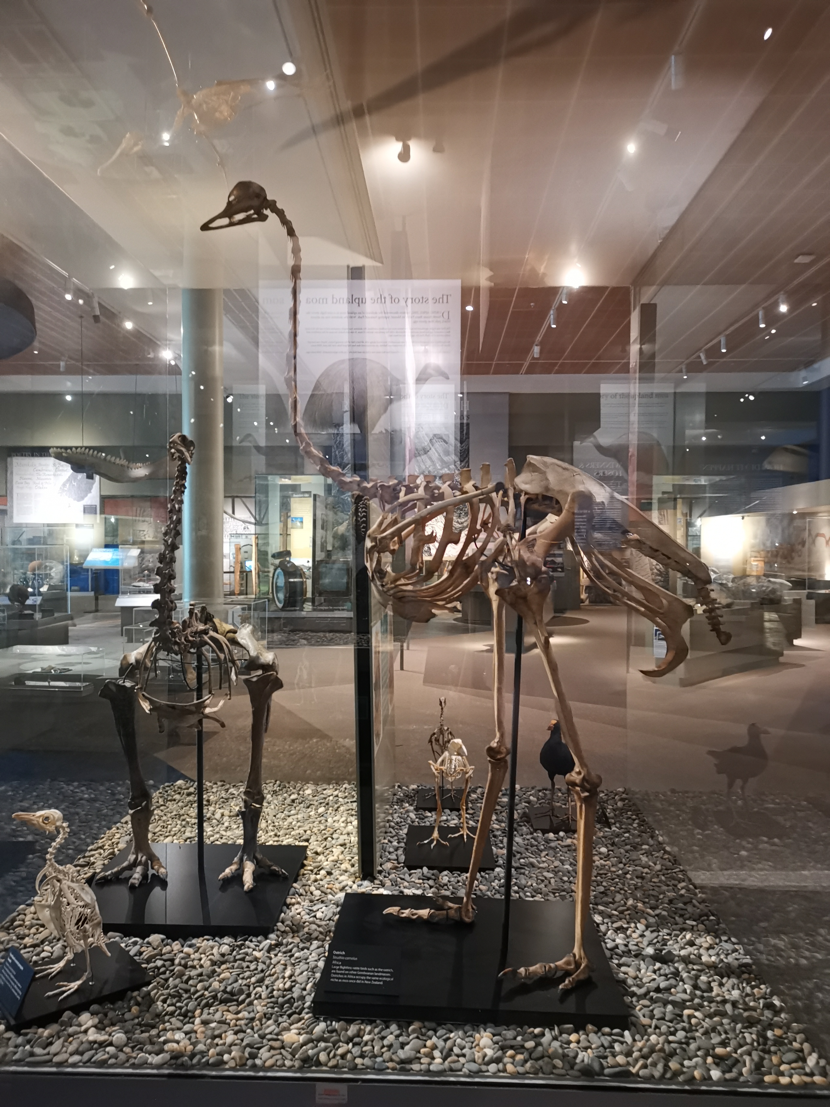 1000多年前,毛利人乘坐独木舟来到新西兰岛定居,用亚麻编制衣物,用动物羽毛和骨骼进行装饰,以捕猎和打渔获取食物,通过雕刻岩石、木头和贝壳等记录文化,利用东西向的怀卡托河运输物品。在与大自然的互动中,毛利人形成了特有的文化特征和神话体系,在他们看来,大自然为人类提供食物,使人类得以生存繁衍。已灭绝的恐鸟就是食物的一种,这种庞大身躯的鸟类,高度可达3米,上肢退化不能飞翔,运动主要靠下肢。博物馆精确还原了新西兰恐鸟的骨骼模型(图2),这是世界上最完整的恐鸟骨骼展示,并在此基础上重建了1:1比例大小的恐鸟模型,附上一根根羽毛,放置在逼真的立体背景中,让参观者身临其境感受遥远时代的野外场景。