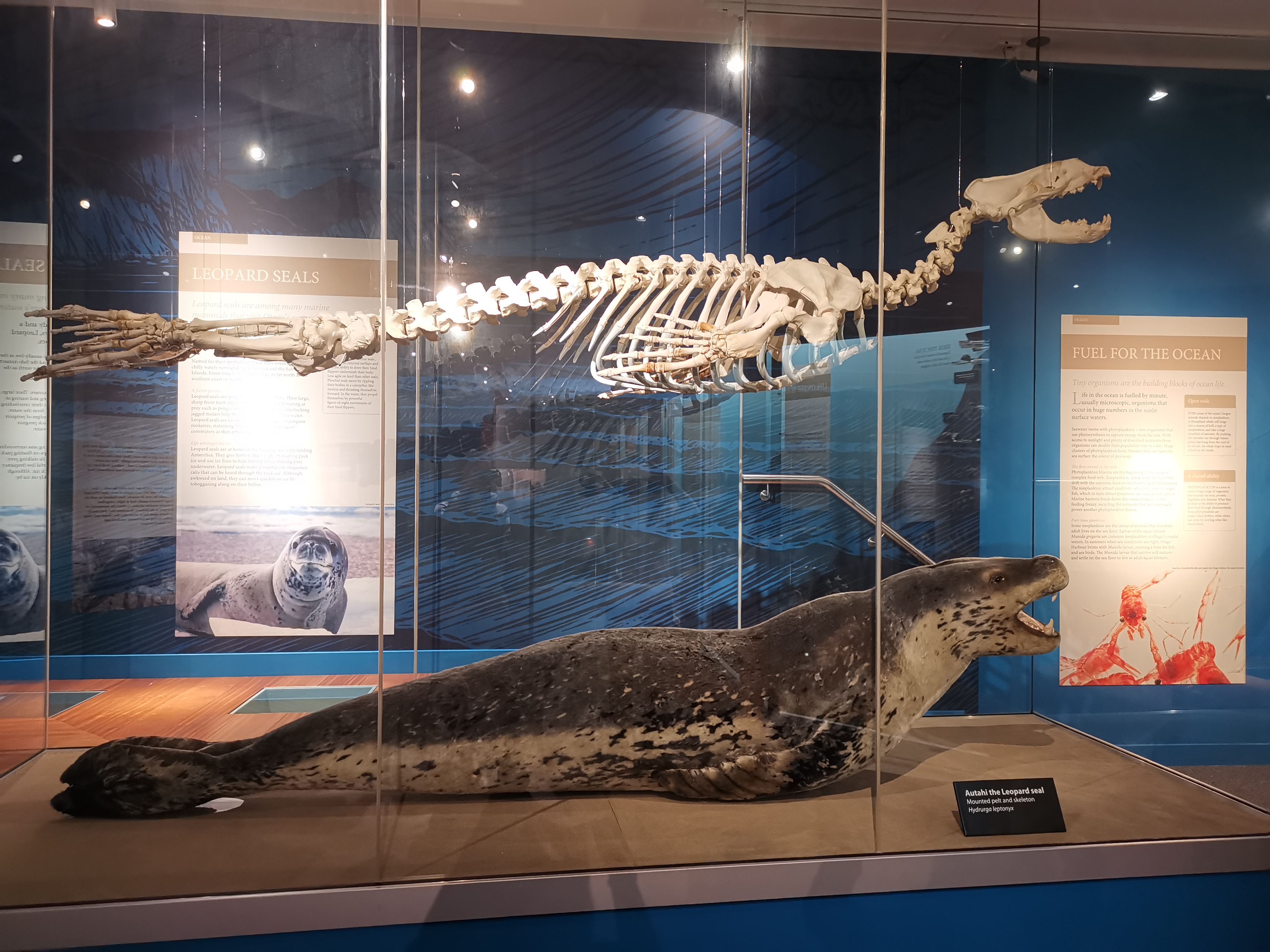 19世纪欧洲人开始大规模移民,新西兰的自然环境遭到进一步的破坏,许多新西兰独有的物种逐渐灭绝,之后随着环保意识的觉醒、环保政策的实施和毛利人自有的文化体系影响,新西兰人对待自然的价值观逐渐形成。如今,新西兰人会记录每天归巢的小蓝企鹅数量,会为每一只海洋生物贴上标签,并帮助它们建造栖息巢穴,野生动物作为人类连接大自然的重要媒介,非常受重视。奥塔哥博物馆展览了新西兰从古至今的各种野生动物,其中颇受关注的便有海豹奥塔希(图3),这是一位生育了几只幼崽的母亲,长3米,近300公斤,2009年在但尼丁北部的海滩找到。奥塔希最终死于肺癌,之后博物馆将其制成标本,皮肤被巧妙地剥去后安装在定制的模具上进行缝合,178个骨头则被单独衔接起来,整个过程耗费了好几个月。展区内奥塔希的皮毛以相同的位置安装在关节骨骼下方,能够让参观者对海豹的内部结构和外部形状进行清晰对比。