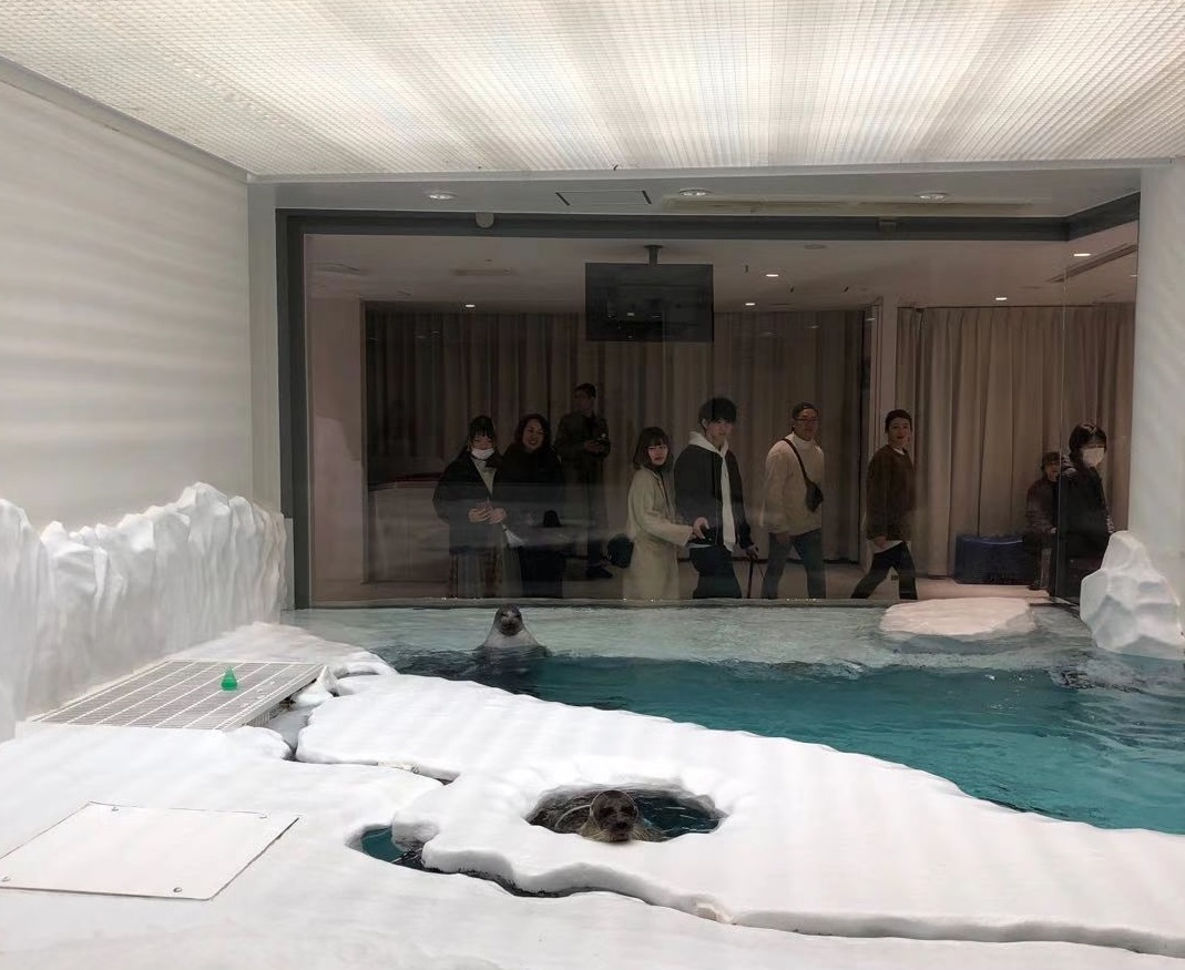 除了用眼睛观赏外,海游馆还引导游客用听觉和嗅觉去体验。馆里的水箱并非都像“太平洋”那样全部封闭,“北极圈”水箱和“福克兰群岛(马尔维纳斯群岛)区”就是半封闭的。这种设计不但能让游客看到动物的动作表情,还能通过它们制造的声音和发出的气味感受其在极地生活的真实情景。“北极圈”水箱采用真冰再现北极圈的真实环境(图2),在这里游客可以清晰地听到环斑海豹的“刨冰声”,配合海豹在流冰之下嬉戏、探头张望的样子,让人仿佛置身于漂浮着寒冰的北极。而“福克兰群岛区”则再现了跳岩企鹅的真实生活,这里的企鹅们会在岩石上跳跃,还会在水中速游,游客不仅能听到它们热闹的叫声,还能闻到它们身上独特的气味。