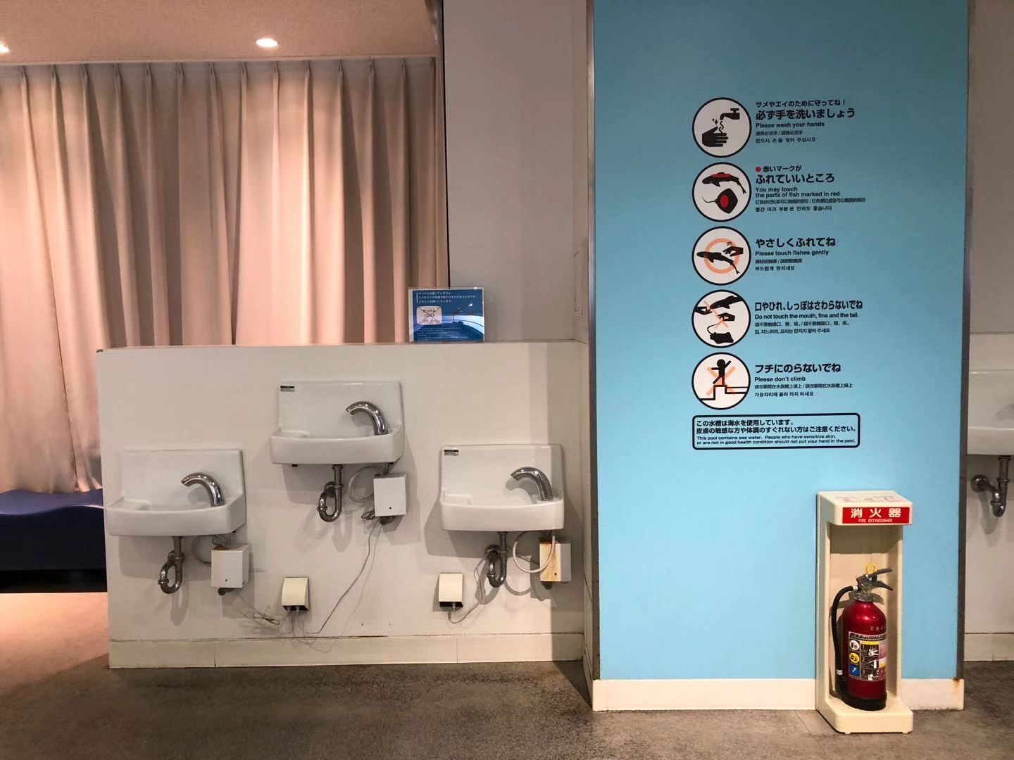 海游馆还给了游客亲手触摸海洋动物的机会。在互动体验区——“马尔代夫群岛”,大家能抚摸到正在游泳的鲨鱼!(图3)这听起来就很可怕,水池旁还有“你可能会被咬到”的提示牌,胆小的游客也许此时就退缩了。但如果遵循海游馆告知的正确触摸方法,游客就能与这种凶猛的动物来次亲密接触。大家消毒双手后(图4),温柔地抚摸鲨鱼的后背,避开鲨鱼的嘴、鳍、尾巴等部位,可以感受到它粗糙的皮肤,还会发现鲨鱼温顺的一面。孩子们尤其喜欢这个区域,这为他们提供一次既安全又刺激的游览体验。