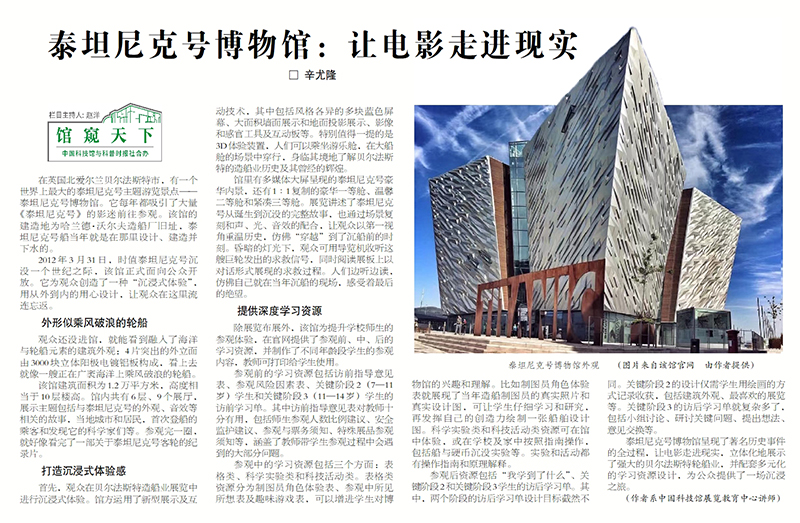 在英国北爱尔兰贝尔法斯特市,有一个迄今为止世界上最大的泰坦尼克号主题游览景点——泰坦尼克号博物馆(Titanic)。每年它都吸引了不少电影《泰坦尼克号》的影迷前往参观。这座博物馆在该市哈兰德·沃尔夫造船厂旧址建造,泰坦尼克当年就是在此被设计、建造并下水的。2012年3月31日,时值泰坦尼克号沉没一个世纪之际,该馆正式面向公众开放。它以为观众创造“沉浸式体验”为目标,用从外到内的用心设计,让观众在这里流连忘返。