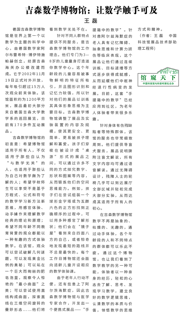 在吉森数学博物馆,数学不再是抽象的、枯燥的、无趣的,通过动手体验各个年龄段的人和不同特点的群体都可以沉浸在数学世界中乐此不疲。通过这个博物馆,也让我们看到了数学教学的另一种可能,体验者以一种亲身的经历,游戏化的心态去了解、思考、发现学习数学,建立良好的数学逻辑思维,认清数学的本质与价值,领悟数学的思维方式和精神。