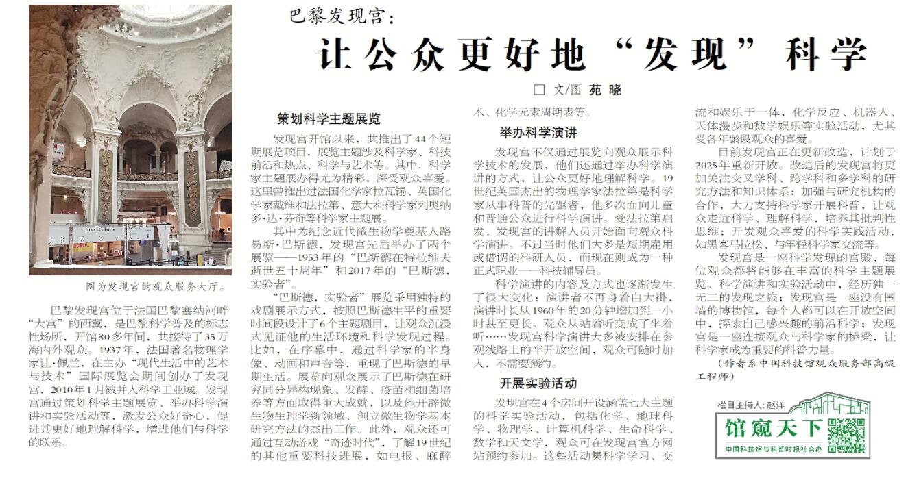 巴黎发现宫(Palais de la découverte)位于巴黎塞纳河畔“大宫”(Grand Palace)的西翼,是巴黎科学普及的标志性场所,开馆80多年间共接待了35万海内外观众。1937年,法国著名物理学家让·佩兰,在主办“现代生活中的艺术与技术”国际展览会期间创办了发现宫,2010年1月其被并入科学工业城。发现宫通过策划科学主题展览、举办科学演讲和实验活动等,激发公众好奇心,促进其更好地理解科学,增进他们与科学的联系。