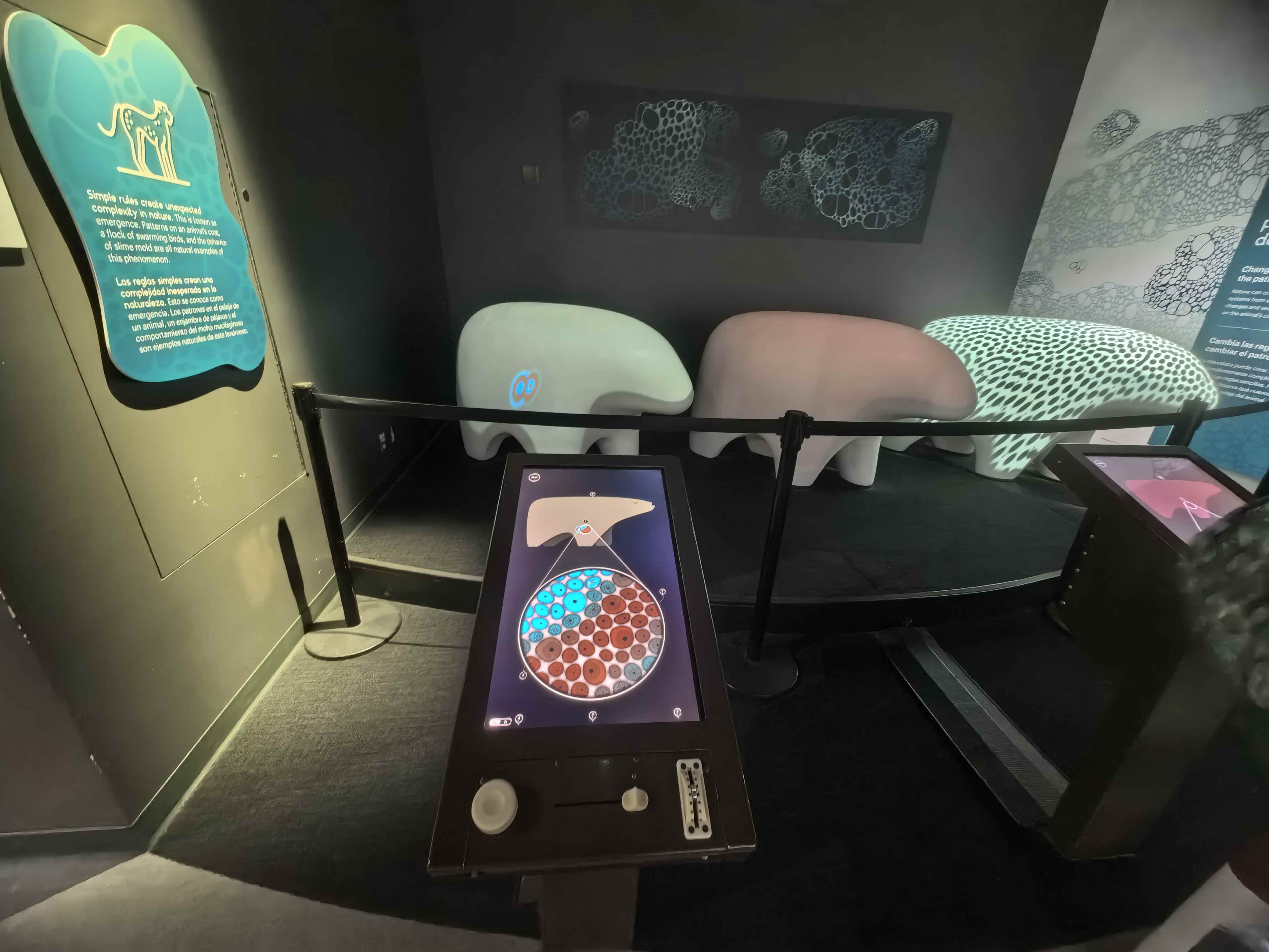 如何将这个概念传播给公众?借助该展品,观众简单互动即可改变动物表皮上微小皮肤细胞所遵循的规则,从而创建新的动物表皮图案。在显示屏上,观众可以通过放大皮肤进入微观世界,近距离观察皮肤细胞的活动,每个细胞都会根据旁边的信号产生不同的颜色,观众可以进行微调或改变,也就是更改了细胞间的规则,从而在动物皮毛上创造出新图案。