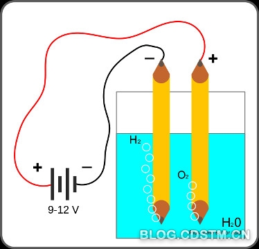 将铅笔的一端放置在水中,另一端暴露在空气中。将导线的一端连接到九伏电池的凸起端,另一端连接至铅笔的铅芯上。几乎是立刻,你就可以看到,水中的铅笔上出现了气泡,水开始分解。每一个水分子是由2个氢原子和1个氧原子组成,聚合在一起形成液体水。分解之后,至少,氢会形成气体,在电的作用下氢原子从水分子中脱落,形成带正电的质子。铅笔芯的负极对此毫无办法,只好独自聚合在铅笔芯周围