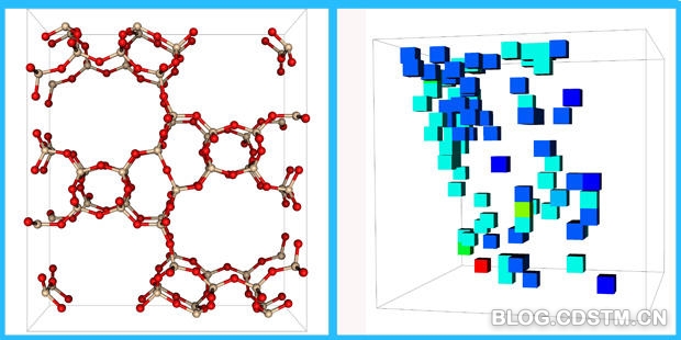 右:Voronoi全息图像显示了左边沸石材料的腔结构。这些空洞的大小和形状决定了什么分子可以通过,什么分子会被吸收。色点显示出特定形状原子在结构中出现的次数。