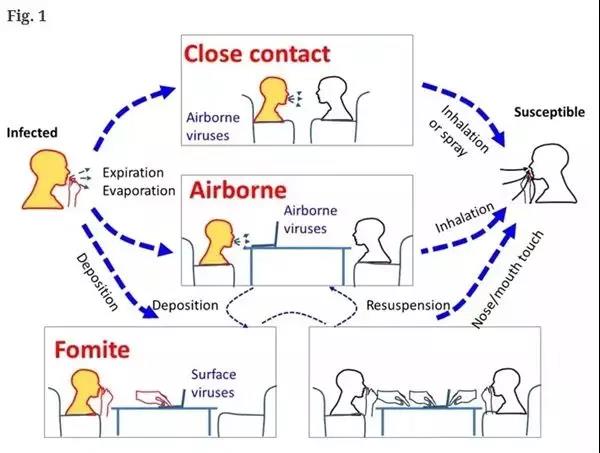 其中,直接传播是指患者打喷嚏、咳嗽或说话时产生的飞沫,被周围的人吸入体内导致的感染;接触传播是指飞沫沉降在物品表面,手部接触污染源后,再用手接触口腔、鼻腔、眼睛等部位的粘膜,从而导致感染。而气溶胶传播,是指飞沫混合在空气中,形成气溶胶,吸入后导致感染。