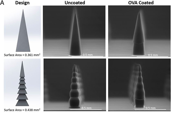 将3D打印的微针排布在聚合物基底上,同时保证(微针的)长度恰好能够向皮肤中注入疫苗,这是一种突破性的进展。