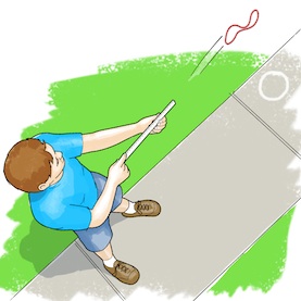 面向空地,用你的粉笔在你的脚尖前面画一条线。这就是你发射橡皮筋时你的脚要对齐的地方,也是你测量橡皮筋飞行距离的标记。