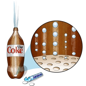 在健怡可乐中,曼妥思糖提供了粗糙表面,使得二氧化碳与水之间的化学键更容易断裂,从而制造更多二氧化碳气泡。当曼妥思糖沉到瓶底,会形成更多的二氧化碳气泡,从可乐中浮出的气泡与溶于可乐的二氧化碳相互反应,释放了更多的二氧化碳,又制出了更多的气泡,引起了喷发。因为曼妥思糖非常紧密,它们快速地沉到液体下面,引起快速、大的喷发。然而,压碎的曼妥思糖不如整粒曼妥思糖密度大,留在瓶子里的液体比用整粒糖时留在瓶子里的液体要多。