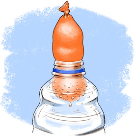 描述所发生的情况还有一种方法是用“吸”这个词,因为水气球是被吸进瓶子的。但是吸是个误导的概念!我们说“吸”这个概念实际指的是液体或气体推某件物体,并且伴随着大小相同的反推力的存在。你可以通过简单的吸出一个空瓶子内的空气压缩这个瓶子。外面空气的压强导致了瓶子的缩小,因为你吸走了里面反推的空气!