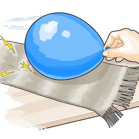静电是电荷在一个物体中的聚集。有时,静电可以突然释放,比如一道闪电划过天空。有时,静电可以使物体相互依附。想一下,刚从烘干机拿出来的袜子是如何粘附在一起的。物体带有相反电荷、即正电荷和负电荷时,便会相互吸引。(带有相同电荷的物体会互相排斥。)有没有足够大的静电,可以使气球粘在墙上?你认为需要摩擦多少次才行?