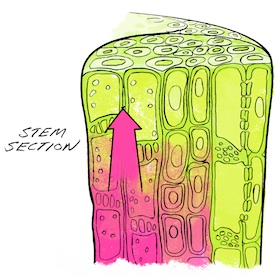大部分时间,植物从土壤中获得水分。也就是说,水分需要从根部向上走,直至遍布整株植物。怎么才能做到呢?水通过毛细作用在植物中运动。毛细作用通过这些内聚力和表面力,植物的茎部可以吸收到水分,就像从吸管中喝水一样。