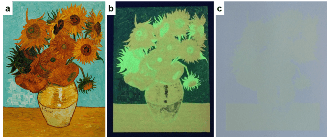 a)采用我们的荧光墨水印制的梵高的向日葵 b) 该画在紫外光下 c) 该画在太阳光下 。图片来源:CC BY-NC-ND