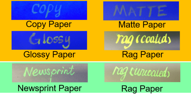 不仅如此,荧光墨水对其应用的表面也很敏感。例如,在标准复印纸上呈现橘色的墨水在报纸上却呈现绿色,这种现象意味着这种新型荧光墨水也可用于识别不同纸张。