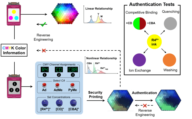 我们开发出了一种验证机制,可以验证用荧光墨水打印出的已有图像中的信息。只要将验证表征物喷洒或涂抹在已打印的图像上即可验证真伪。尽管不同配方的墨水可能看上去颜色相同,但是当验证表征分子(如环糊精)加入时,不同配方的墨水就会有不同的反应。有许多可以引起不同颜色变化的验证表征物。这种验证机制靠的就是墨水原料中复杂分子的相互作用,所以即使伪造者能模仿出原始的荧光色彩,但是在验证阶段却几乎不可能复制出相同的颜色改变。