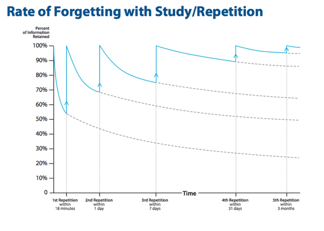 图上显示,如果学生能在24小时内回顾自己的笔记(重新阅读/讨论/写/参与),那么遗忘率就会最小。而在一天之内进行仅仅短时间的二次复习就能够将回忆起近100%的内容。而在一周之内进行一次更短时间的三次复习就可以回忆起100%的内容。