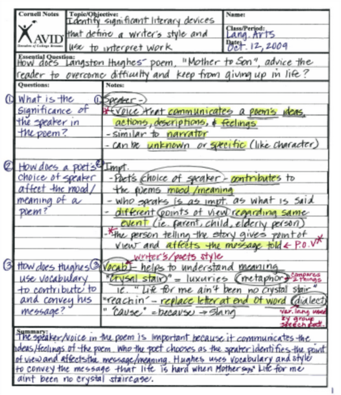 图2:一些语言艺术课上康纳尔笔记系统的笔记示例。图片来源:Advancement via Individual Determination (AVID), Author provided