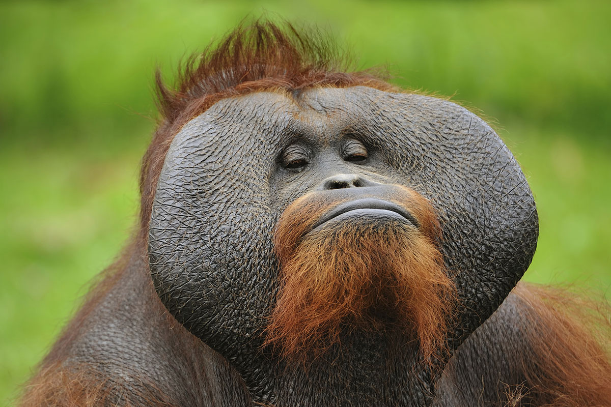 猩猩是类人猿里除了人类以外唯一有发育成熟的胡子的。雌雄两性的脸颊上都挂着红色海盗式凌乱的胡子,这说明我们共同祖先的雌性也有胡子。进化生物学家认为胡子血统的进化最初是为了让生活地方在一起的不同古人猿物种之间能够辨认出自己的种群,只是后来出现了雄性性吸引的功能。猩猩的胡子不是用于性展示的,相反,雌性更容易被肥大的脸盘和袋状的喉咙所吸引。