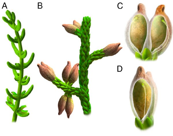 广义上的裸子植物,包含蕨类和针叶树类,只产生种子,不形成果实。更早期的植物比如苔藓和地钱,连种子都不形成,只形成有孢子。按照这队欧洲科学家的说法,即便没有任何类似于我们认为的“花”的结构,Montsechia 仍然拥有了特征可识别的果实。