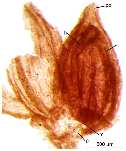 po=气孔, f=珠柄, h=种脐, pl=胎座, m=珠孔。Fig. 2(图片来源 Gomez et al. 2015)