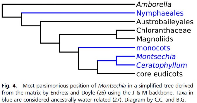 Montsechia 类似于古果属(Archaefrucus),古果属曾经也被认为可能是“最早的花”而在十年前引起过轰动,它们的花都很小,貌不惊人,都是水生,它们都是这个头衔的有力竞争者。然而它们还有很多对手,在下面开花植物起源的系谱图里,水生植物或者可能由水生植物演变而来的植物都被标成了蓝色。