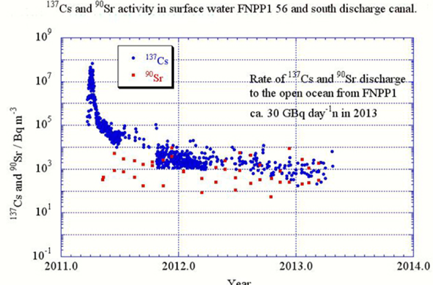 福岛核电站周围海水中的铯(CS)和锶(SR)的水平在事故发生后快速下降,但是两年后依然高于事故前的水平。