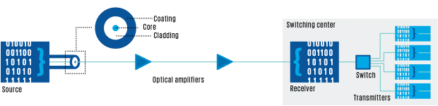 目前最普遍的光纤,是以其中9mm宽的玻璃芯为核心的,它们几乎可以完全投射1.55微米波长的红外光。在光纤内芯外面,包裹着超过50微米厚的玻璃覆层,相比玻璃内芯材料,它们的折射率较低。因此,在其中传播的激光信号就被限制在内芯之中,并且通过内反射跟随光纤的走向,曲折着向前传播。