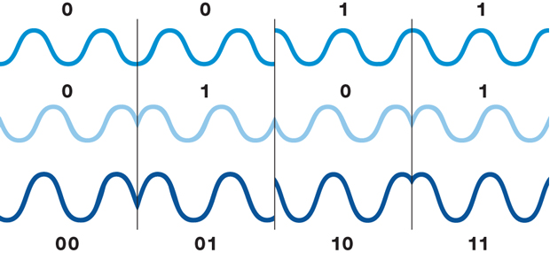 一个光波的相位,即波峰和波谷的到达时间,可以用来对信息编码。四相位编码方式中,四种不同的相位(由图中上、中两个有一定相位差的二相位编码信号叠加而成)可以表示两位编码的四种情况(图中下方波形)。