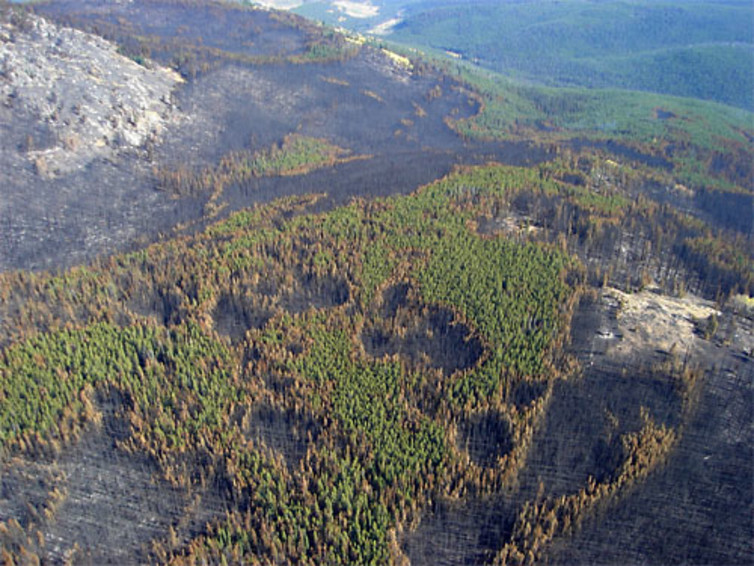 2006年 Tripod 火灾的部分火势留下了一片由不同时期的树木构成的马赛克式的森林,这些树木可以阻止大规模、连续性的火灾。这就证明指定焚烧以及间伐会让森林的修复力更强。来源:美国林务局。