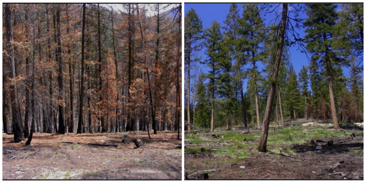 平均而言,在经间伐及指定焚烧的森林中,有四分之一的成年树木死于火灾,而与未经处理或者间伐的森林中,这一比例却高达60%到65%。行驶在Tripod火灾的灾后现场,你会发现指定焚烧过的局部森林通常是绿悠悠的一块,就像是一片死树遍地的灰色大海中的一块绿岛。