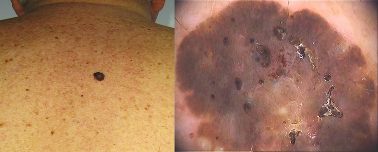 这个病变乍看很吓人,但是在皮肤镜下它显然是像山龙眼的样子,也就是说它是个良性的脂溢性角化。图片来源:昆士兰大学