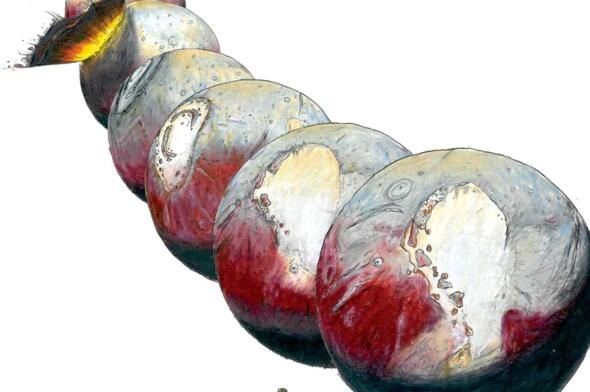 去年美国宇航局(NASA)的“新视野”号探测器飞掠冥王星时,一切都变了。探测器发现的这颗矮行星的众多奇迹中,最引人注目的是一个1600公里宽的心形平原铺展在这个遥远的星球的表面。为纪念冥王星的发现者,美国天文学家ClydeTombaugh,这片心形地区被命名为“Tombaugh地区”。Tombaugh地区及冥王星其他地区的裂缝表明,地表下的泥浆可能会慢慢凝固,会像水在冰箱中凝固成冰一样膨胀而撕裂地表,不过其他的可能性也可以解释这种裂缝。周三在《自然》杂志上发表的两项研究找到了更有力的证据证明,冥王星心形冰面之下有一个更温暖、更湿润的世界。