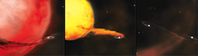 一颗Ia型超新星的演变方向具有如下几种可能:(左)“白矮星+红巨星”双星系统中的白矮星;(中)“白矮星+类日伴星”双星系统中的白矮星;(右)“白矮星+白矮星”双星系统中的白矮星。图片来源:NASA/Swift/Aurore Simonnet, Sonoma State Univ, CC BY
