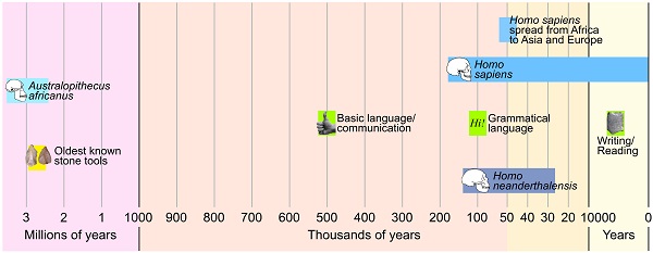 图1 – 语言进化时间表。250万年前,人类就会使用工具;50万年前,人类才进入了通信“吼”时代,相对而言,读写对于人类来说是一项新技能。我们使用的系统化的语言和相应的语法结构是在大约十万年前形成的,而读与写的历史仅仅只有几千年。