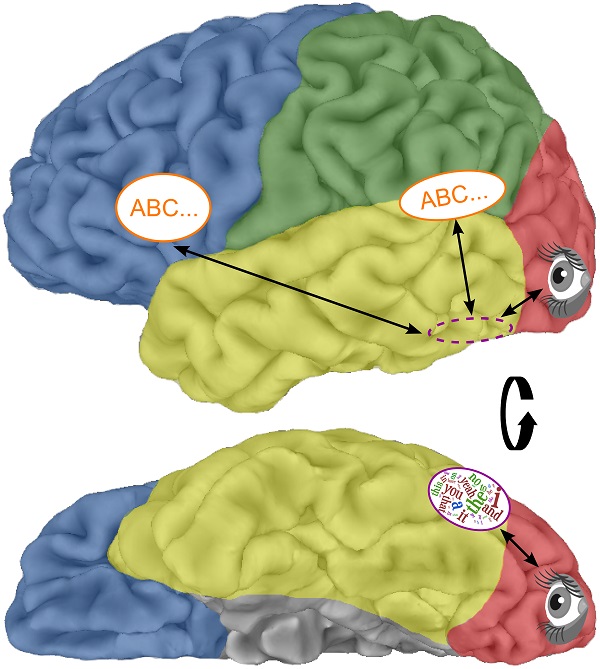 图3 – 大脑中的词汇库。图中上半部分显示的是大脑左半部分的侧视图,亦称左侧半脑。下半部分显示的是左脑半球的仰视图。人类的大脑皮层(也就是那个充满沟壑的表面)被划分为四部分:枕叶皮层(红色)、颞叶皮层(黄色)、顶叶皮层(绿色)和额叶皮层(蓝色)。我们眼前所见的事物都通过视觉系统分析,而视觉系统则位于枕叶皮层(图中的眼睛标记处)以及部分的颞叶和顶叶皮层区域。人类的大脑已经进化出了专门处理语言信息的区域,我们对语言的表达和理解都在图中橙色边框的椭圆标示区域进行。词汇库或者说视觉词形区,是大脑中用来识别以书写形式表达的单词的部分,以紫色边框的椭圆标示。只有在仰视图中才能看见这部分区域。词汇库扮演了视觉系统与语言系统间的转换器的角色。