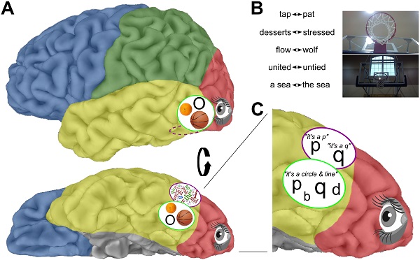 大脑中有三分之一的部分同时与视觉和语言相关。我们称其为词汇库(wordbox),或者通常被称为视觉词形区(visual word form area)。这部分脑域将图形信息(如一系列点、圈和线组合而成的单词)转化为大脑中掌管语言的区域可以理解和处理的信息。总的来说,词汇库就是大脑中专门识别书面形式单词的一个区域。