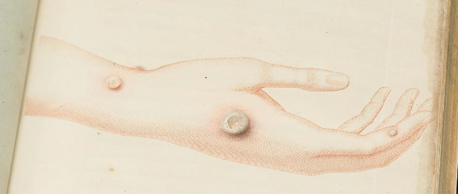 手部的牛痘斑痕。图片来源:Jenner, Edward, 1749-1823. Inquiry into the causes and effects of the variolae vaccinae; National Library of Medicine (Public Domain)