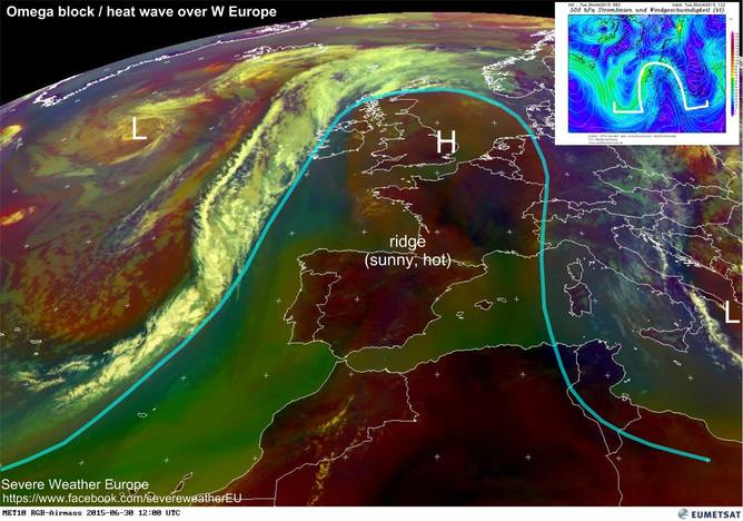 6月30日欧洲上空的Ω阻断。图中突出显示的线即为Ω形急流。图片来源:Severe Weather Europe / EUMETSAT