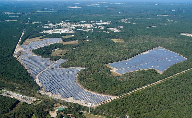 在纽约长岛的一个32兆瓦特的太阳能电厂,这是迈向使用低碳能源基础设施的一步。(图片来源:brookhavenlab/flickr, CC BY-NC)
