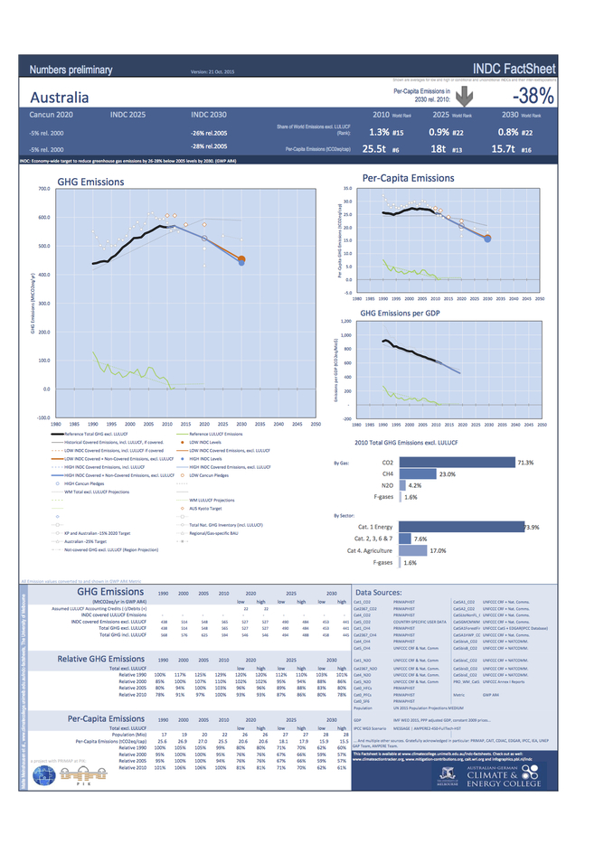 这份概况介绍有助于我们去比较各个国家的减排预案。例如,当我们需要查找人均排放量时,我们可以从澳大利亚的减排预案中发现,2030年的排放量相较于2010年将减少38%,同一时段,美国的排放量将减少39%。