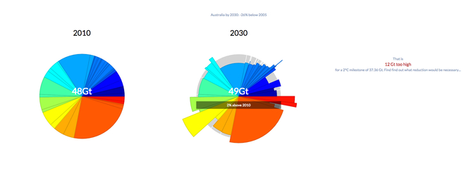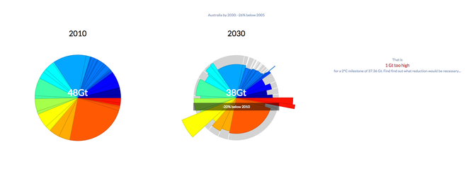 首先,选择任意一个国家,再选择它的减排目标。默认设置显示的是这些国家已经提交的预案,但你仍然可以随意选择减排方案。